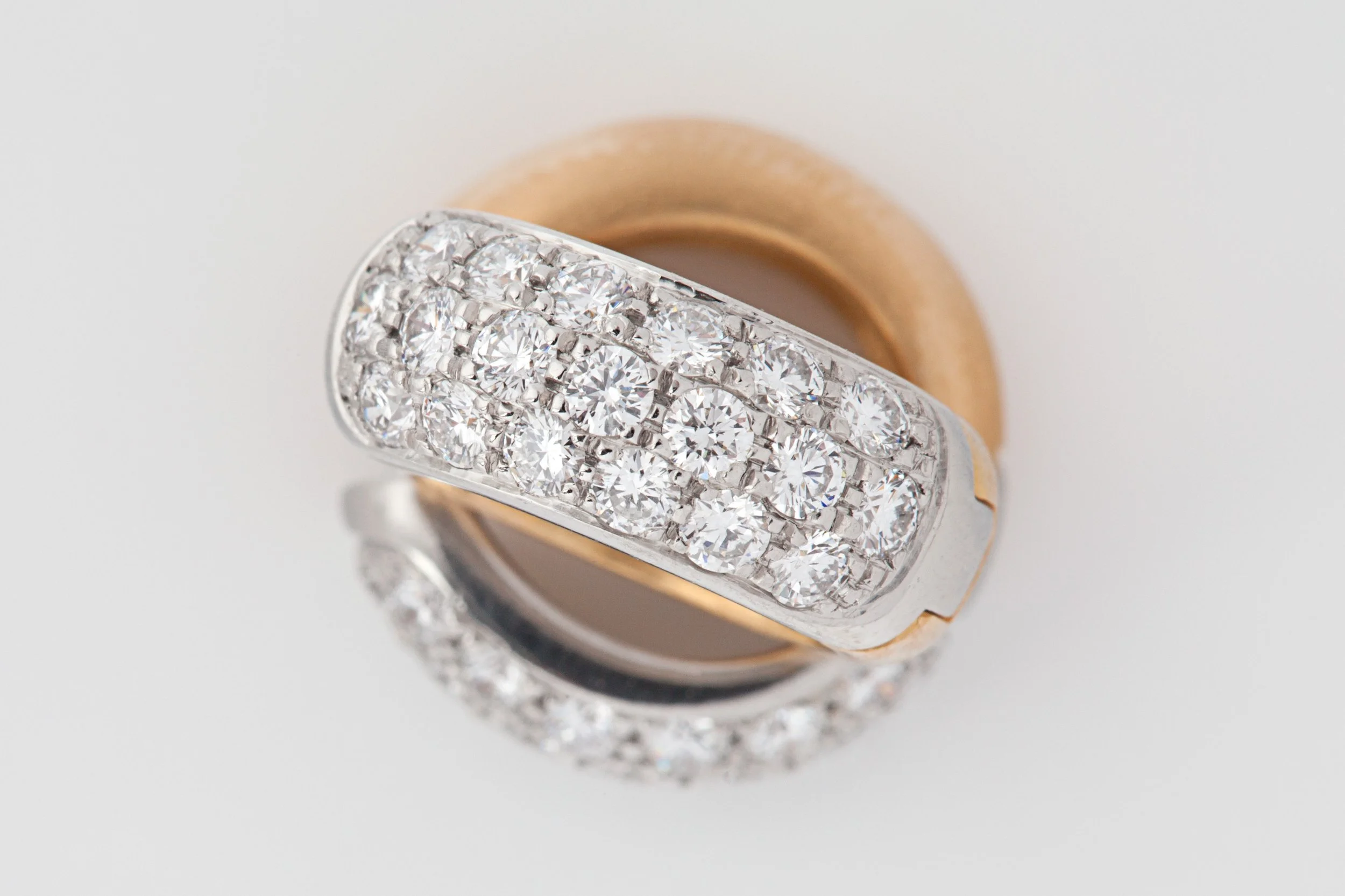 Platinum and 22k yellow gold “huggy” style earrings set with diamonds.