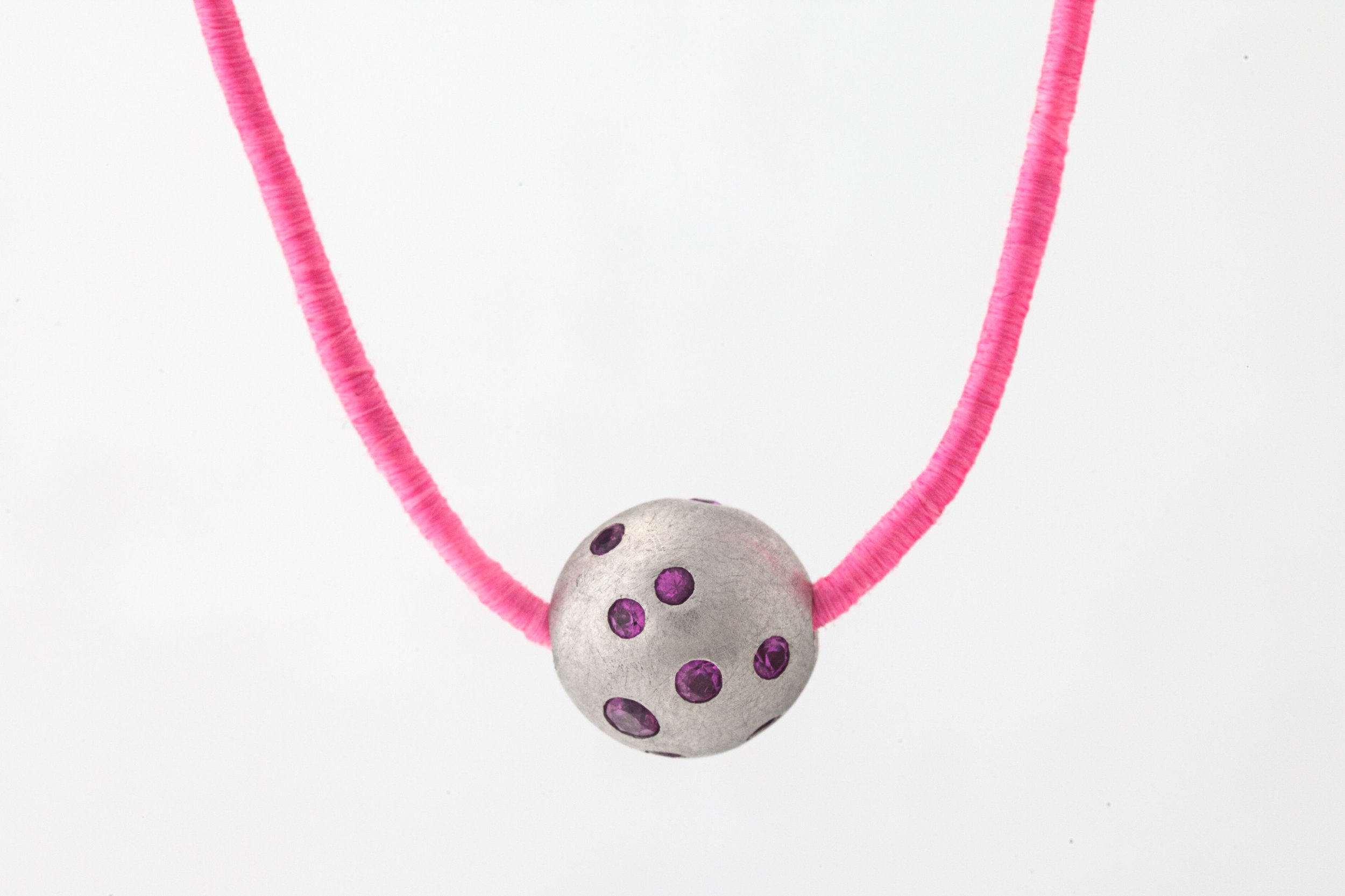Handmade platinum bead with a matte finish, featuring natural pink sapphires. Photographed on pink silk nylon cord.