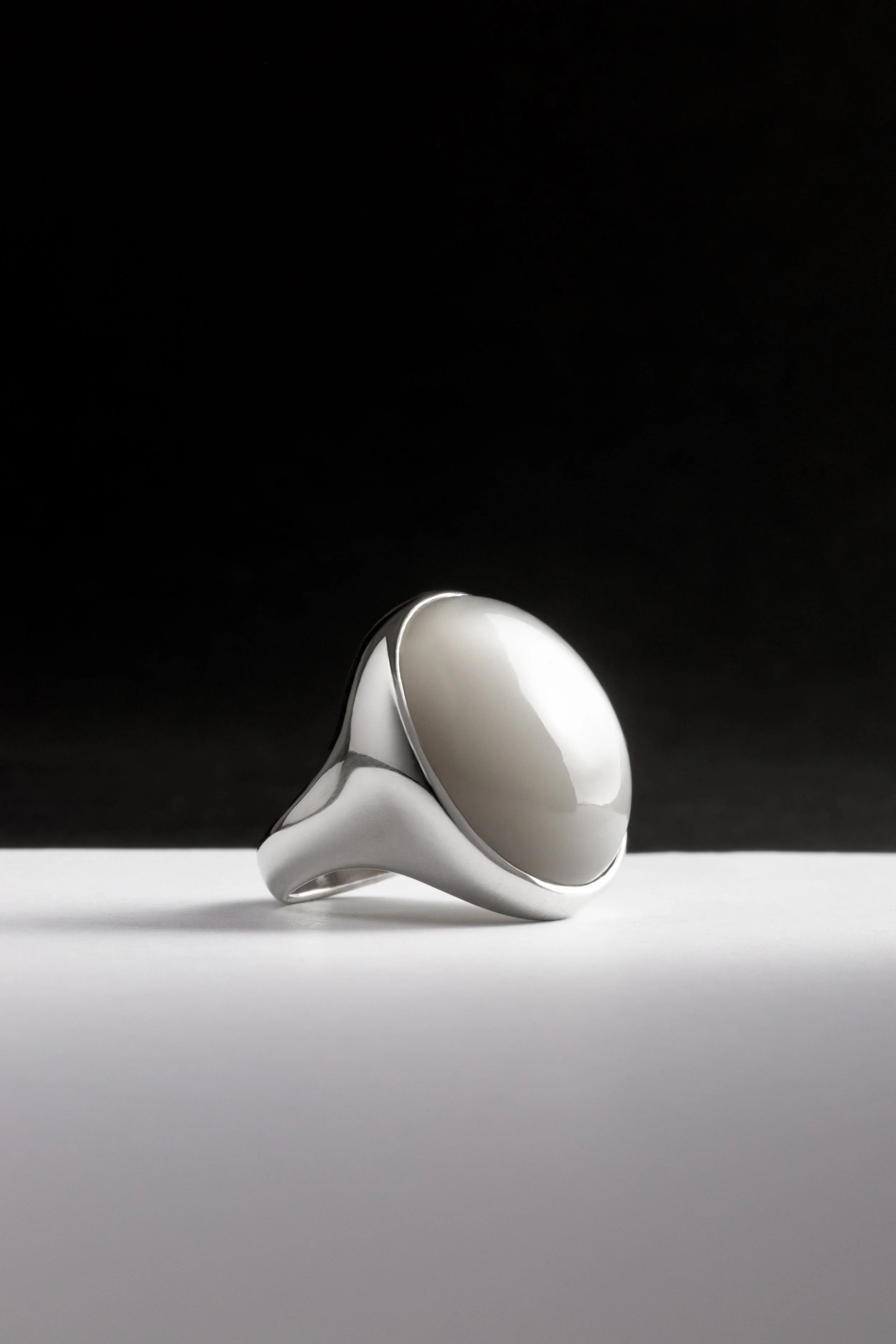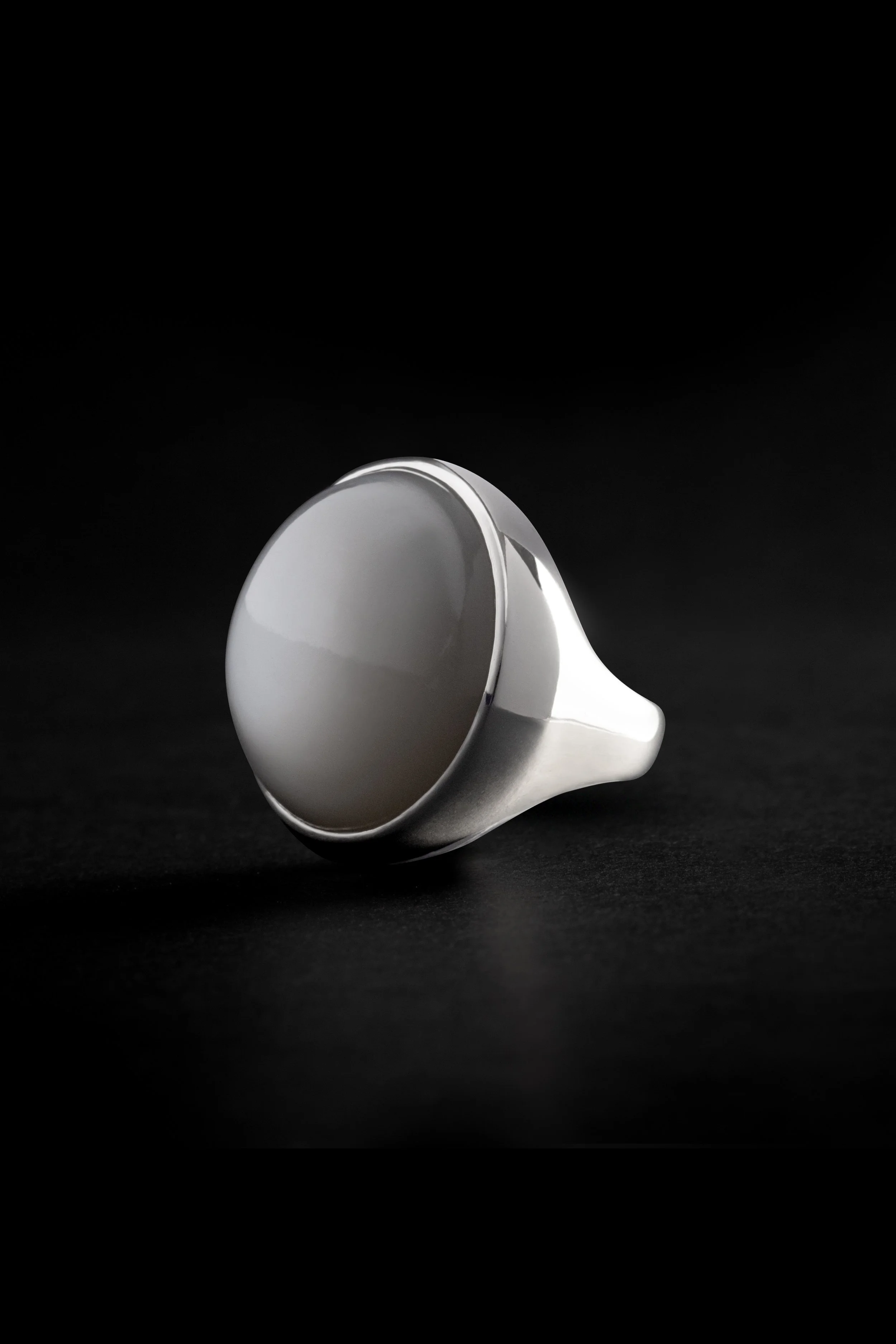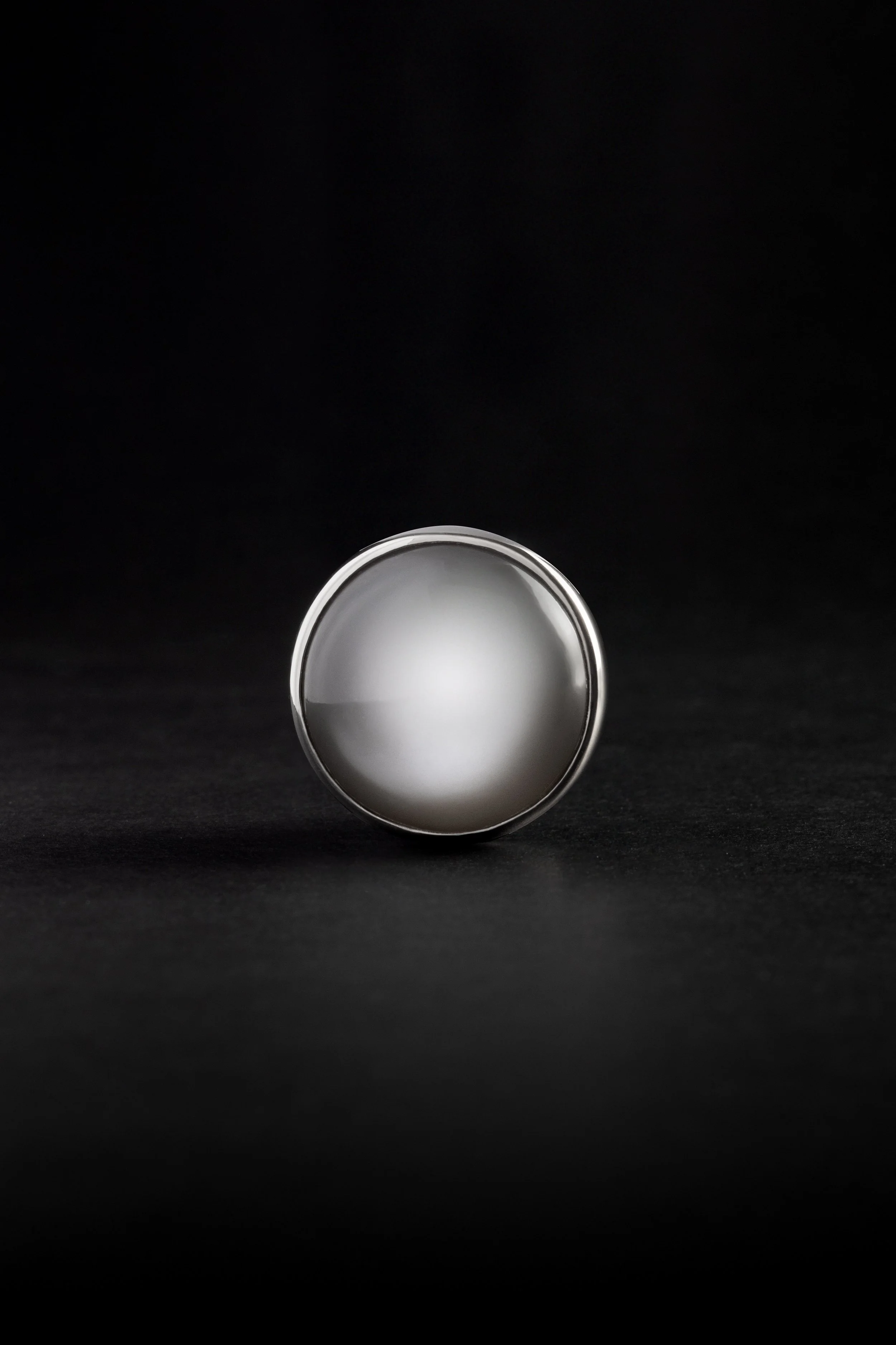 GREY MOONFull Moon Ring:Platinum ring with bezel-set silky grey moonstone. View fullsize View fullsize View fullsize