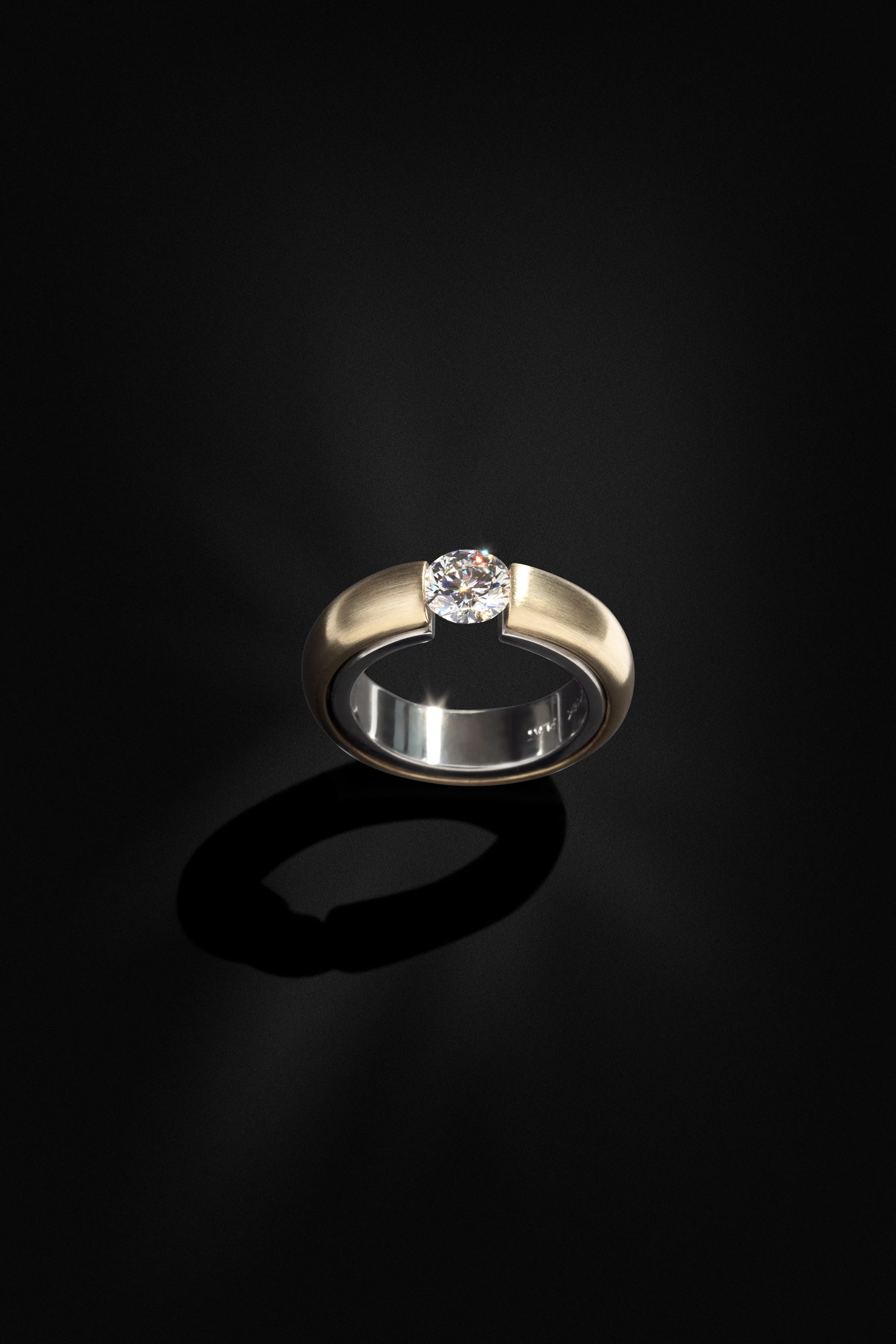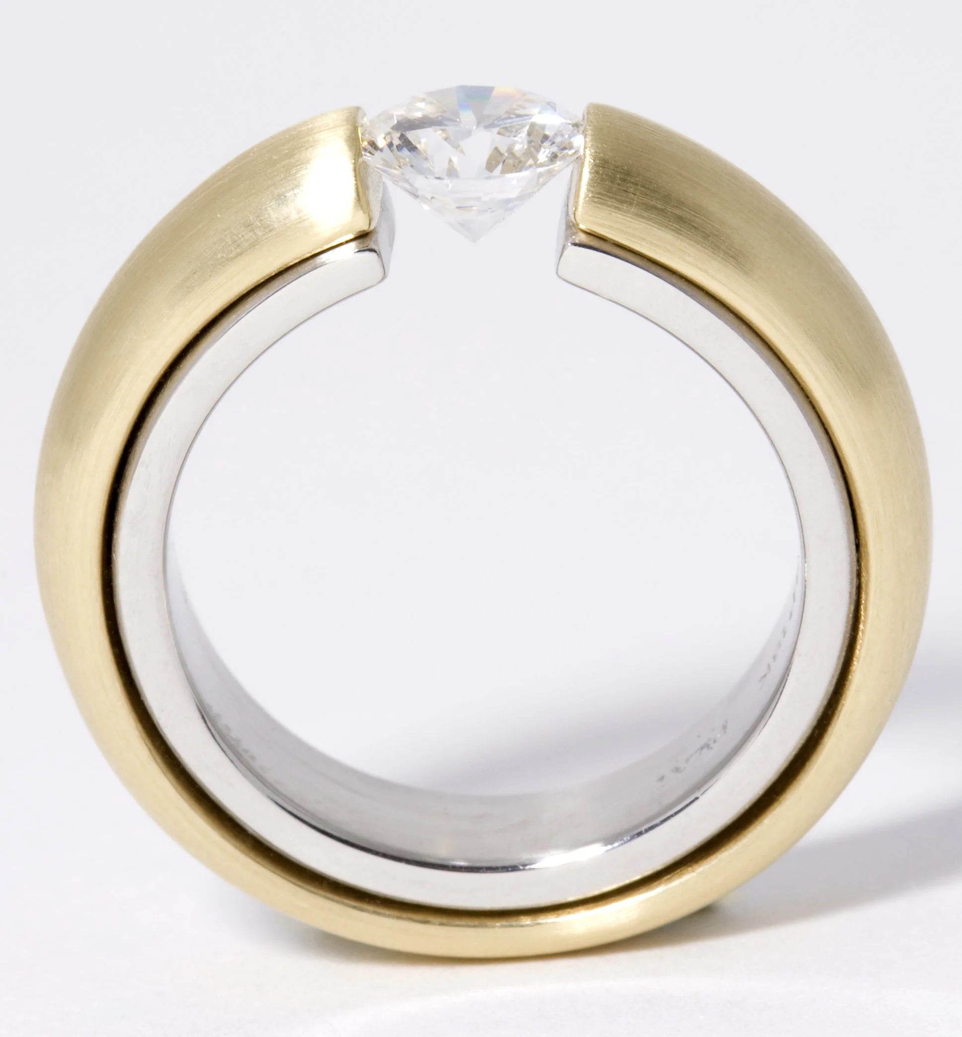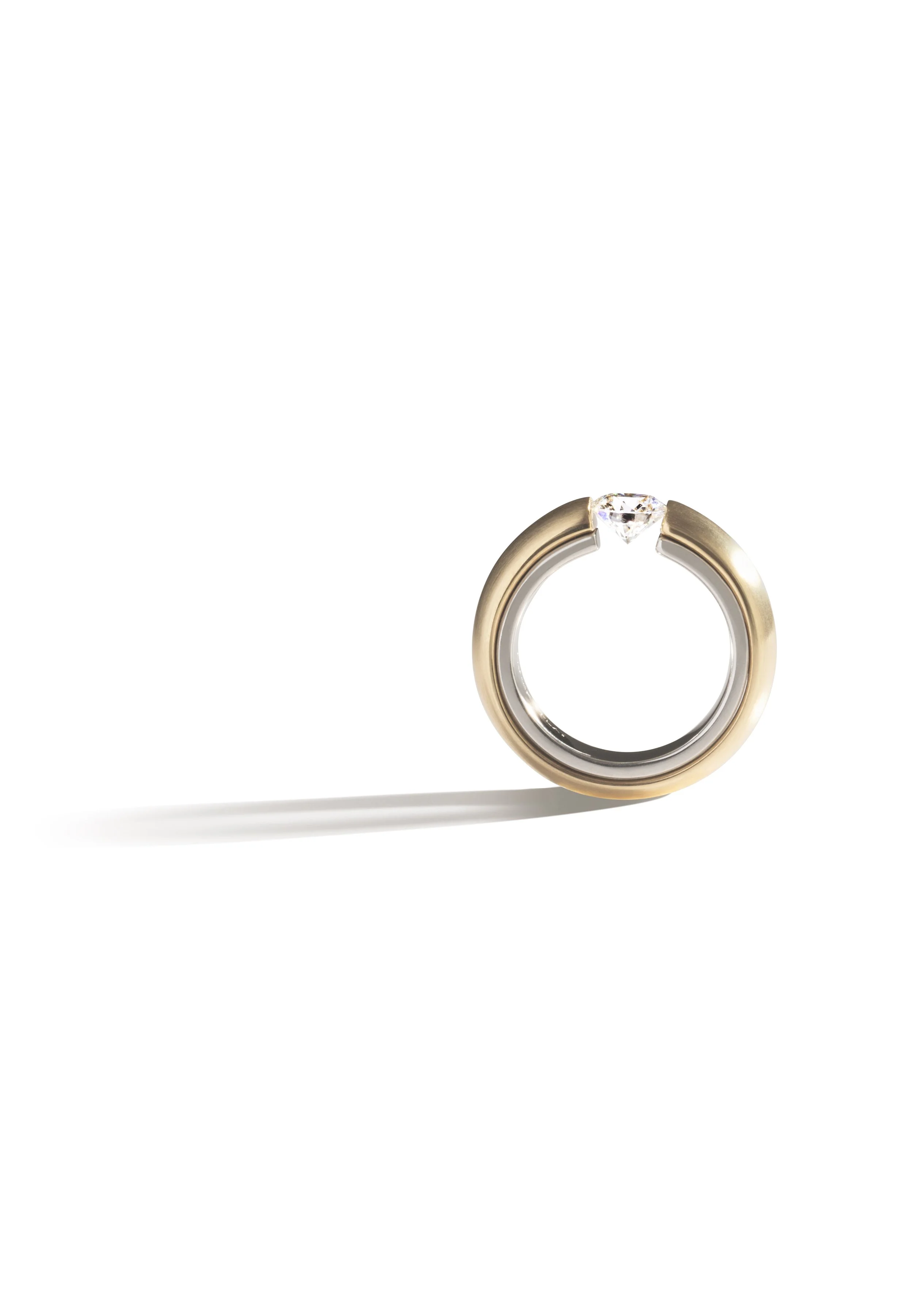 ICONTwo Tone Tension Ring:Handmade platinum and18k yellow gold tension ring featuring a colourless diamond. View fullsize View fullsize View fullsize View fullsize